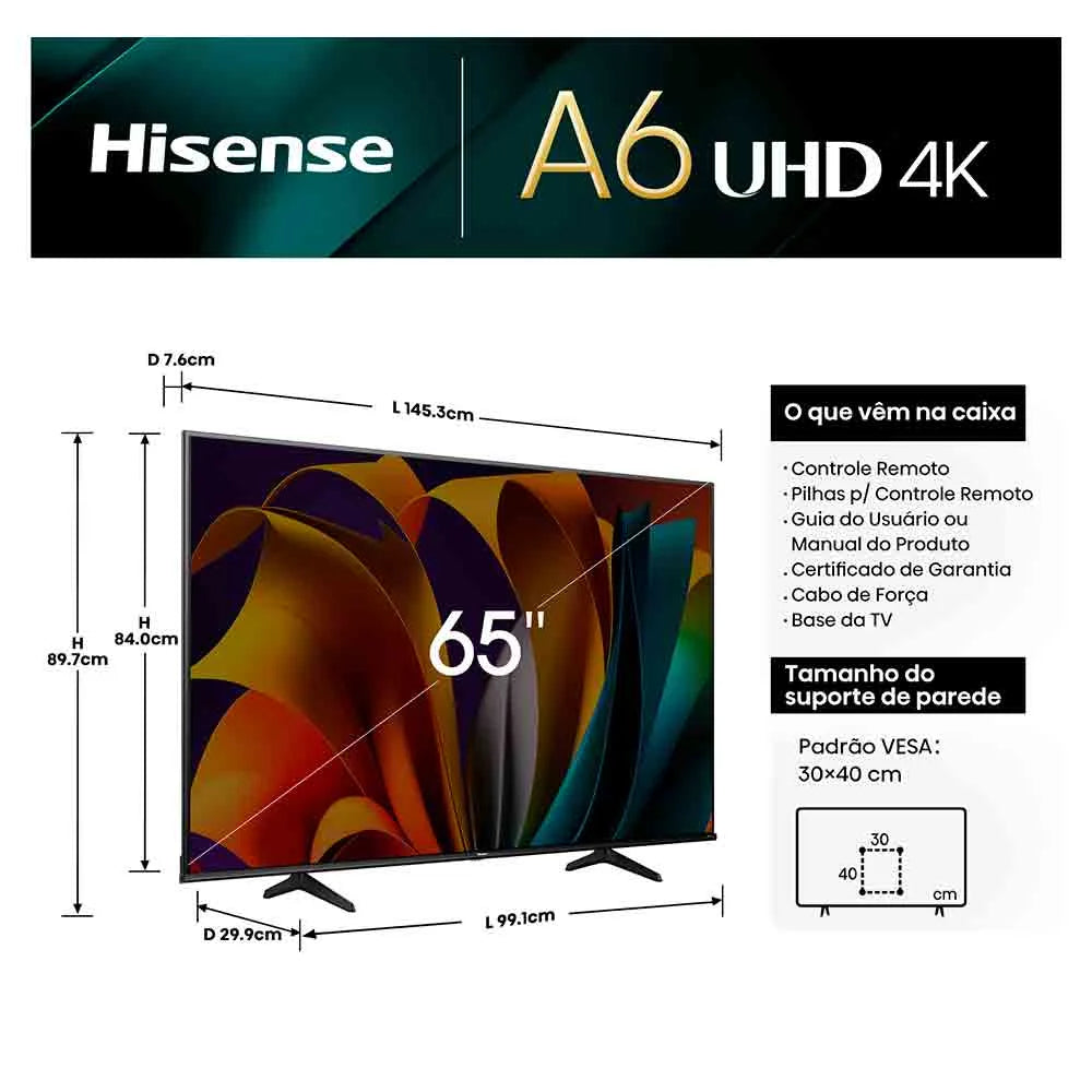 A Smart TV Hisense DLED 4K de 65 polegadas, modelo 65A51HUV, é uma escolha excepcional para quem busca qualidade de imagem, inovação e durabilidade. Com resolução 4K e tecnologia LED, proporciona imagens nítidas e cores vibrantes de qualquer ângulo, graças ao seu ângulo de visão de 178°. Com Wi-fi integrado, HDMI 2.0, USB e Bluetooth Audio, oferece diversas opções de conectividade para tornar a sua experiência de entretenimento ainda mais completa. Além disso, a TV também possui recursos convenientes como Sleep Timer, controle remoto e um menu disponível em diferentes idiomas.