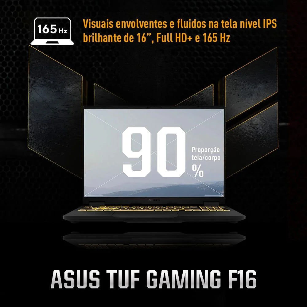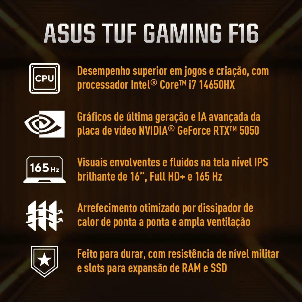 Apresentamos o Notebook ASUS TUF Gaming F16 FX608JHR, uma máquina de alta performance destinada aos gamers e profissionais que buscam potência, versatilidade e durabilidade. Combinando um processador Intel® Core™ i7 14650HX de 14ª geração e uma placa de vídeo NVIDIA® GeForce RTX™ 5050, este equipamento oferece máximo desempenho para jogos de última geração e aplicativos de produtividade. A tela de 16 polegadas nível IPS de 165 Hz proporciona uma visualização de alta qualidade, enquanto o sistema de arrefecimento avançado mantém a estabilidade do desempenho mesmo sob alta demanda. A resistência de nível militar e a capacidade de expansão de RAM e SSD garantem a durabilidade e versatilidade do produto.