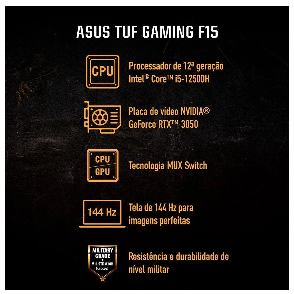 A tela de 15,6” IPS Full HD com 144 Hz de taxa de atualização proporciona uma experiência visual suave e imersiva. A tecnologia Adaptive-Sync sincroniza a taxa de atualização da tela com a placa de vídeo, reduzindo o lag e minimizando os engasgos. O chassi do ASUS TUF Gaming F15 foi projetado para resistir a quedas, vibrações, umidade e temperaturas extremas, passando por testes de nível militar do certificado MIL-STD-810H para garantir sua