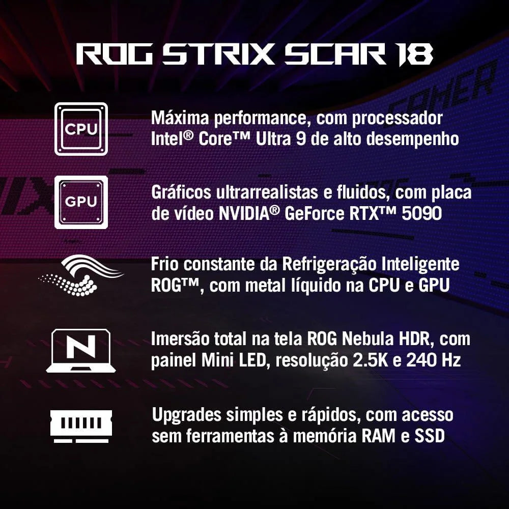 Notebook Gamer ROG Strix SCAR 18 G835LX NVIDIA RTX5090 Intel Core Ultra 9 275HX 64GB Ram 4TB SSD Windows 11 Home Tela 18" 240Hz Black - SA013W
