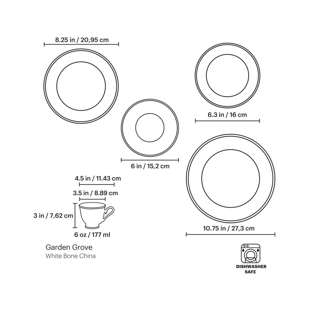 Este conjunto inclui um prato para jantar, um prato para salada, um prato para pão, uma xícara e um pires. Cada peça é cuidadosamente decorada com acentos de ouro 24 quilates e um padrão floral azul sobre a durável e imaculada porcelana branca. Um verdadeiro destaque para qualquer mesa.