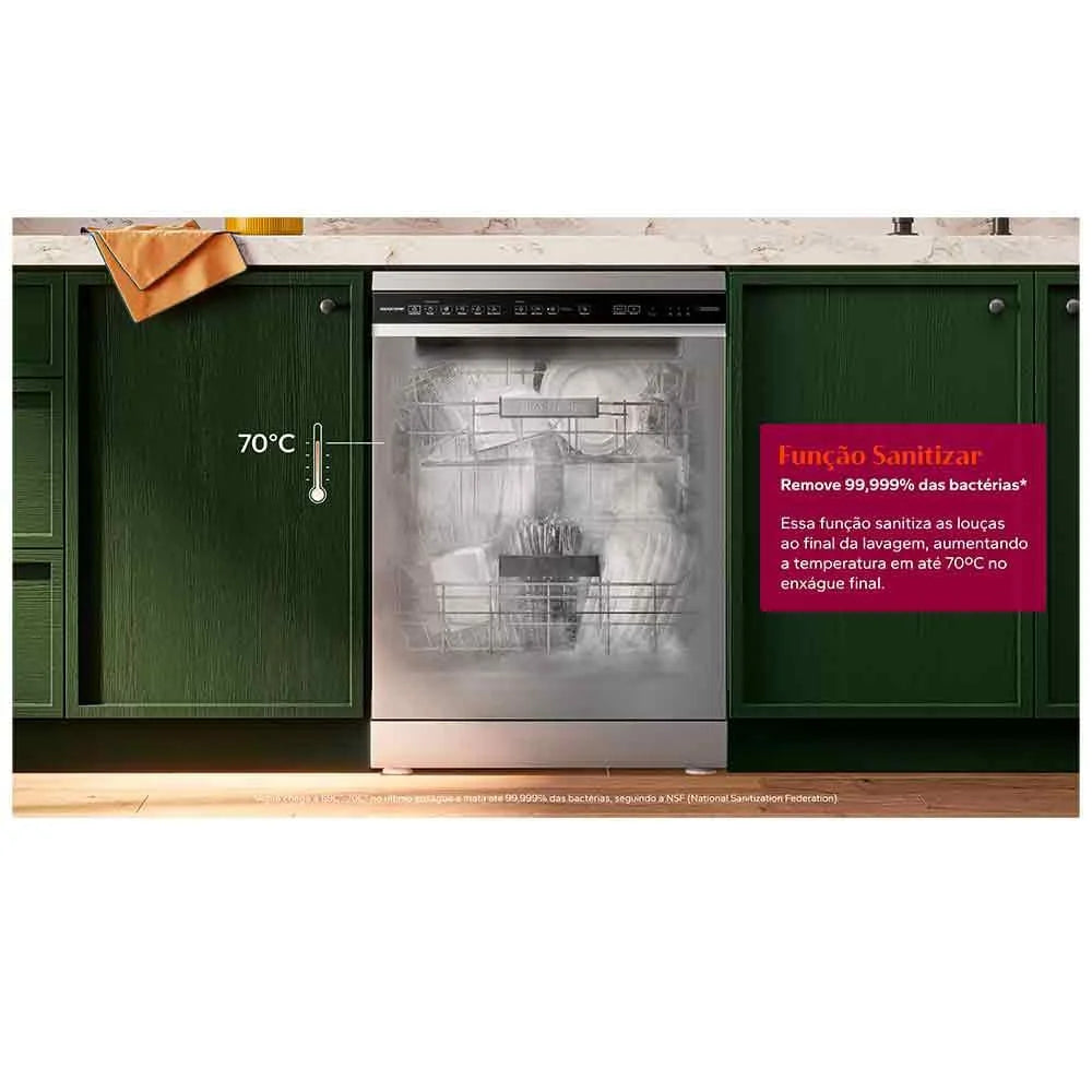 Outro destaque é a Secagem Inteligente, na qual a porta se abre automaticamente para sair o calor no final do ciclo, proporcionando uma secagem mais eficiente e economia de energia. A capacidade desta Lava-Louças é de 15 serviços, oferecendo 8% mais espaço interno que o modelo anterior, sem alterar seu tamanho externo.