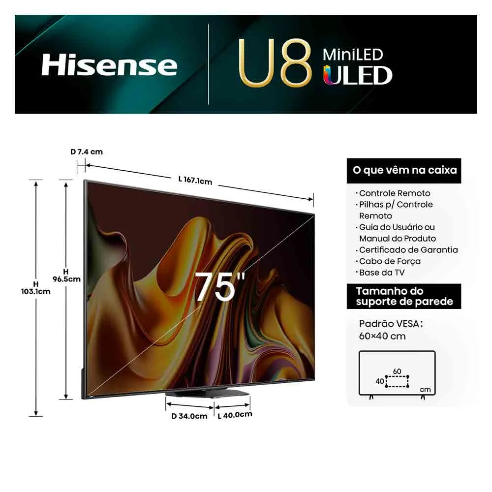 Se você busca uma experiência de visualização imersiva, a Smart TV Hisense Mini LED UHD 4K 75" é a escolha ideal. Com tecnologia QLED e resolução UHD 4K, garante imagens nítidas e cores vibrantes. Sua frequência de 144 Hz permite uma exibição suave de conteúdo em movimento, tornando-a ideal para jogos e conteúdos de ação. Além disso, sua conectividade Wi-Fi e Bluetooth de áudio proporcionam maior flexibilidade e facilidade de uso.