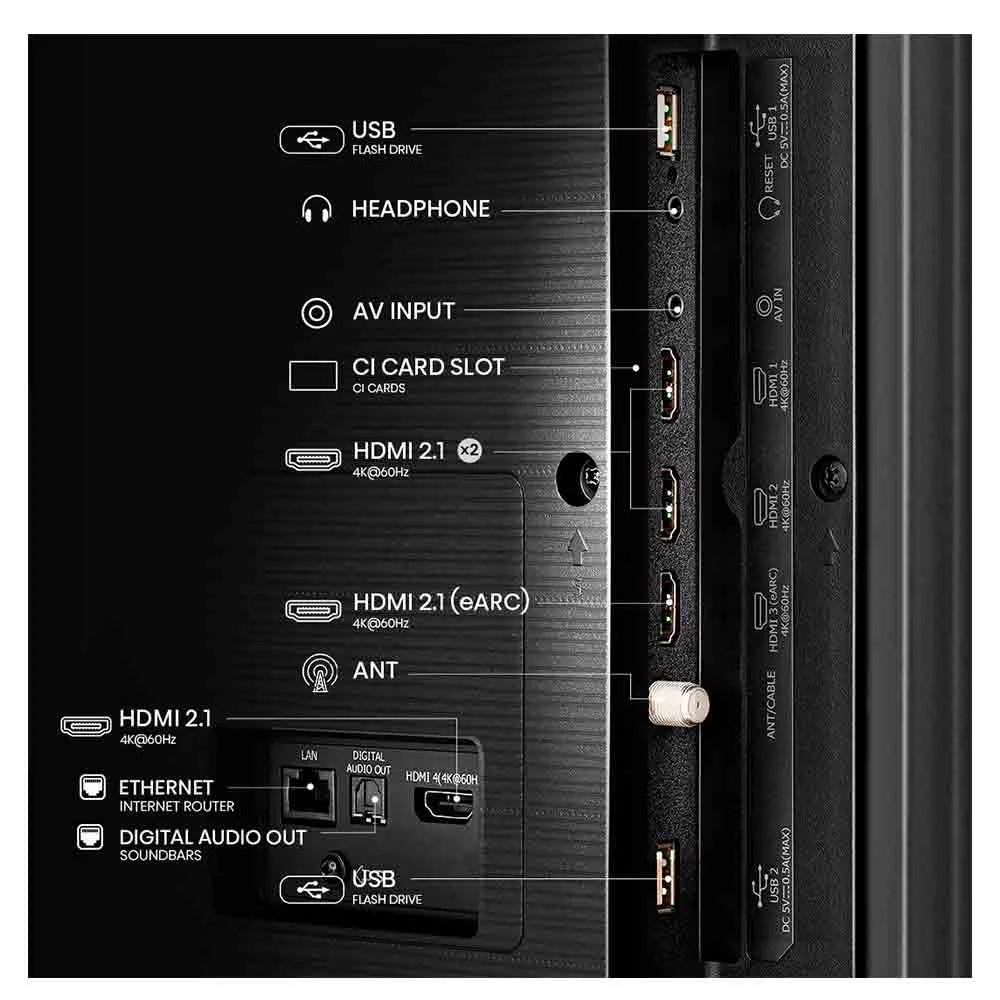 - Portas de Entrada e Saída: HDMI type 2.0 with HDCP version 2.1 (3), Entrada de Vídeo Composto, Ethernet (LAN), Av Composto/In - Digital Audio Out - Ant - Headphone, Saída de Fone de Ouvido, 02 Conexões USB