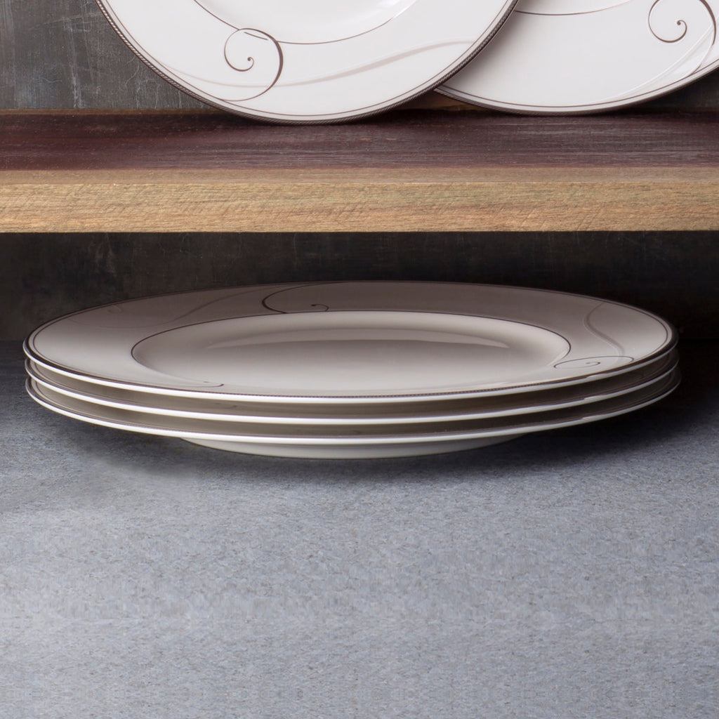 Com um toque de platina ondulando pela borda dos pratos, este jogo apresenta uma proposta ousada, porém sofisticada. A simplicidade moderna do design não é apenas esteticamente agradável, mas também funcional, tornando-o perfeito para ocasiões formais e uso diário.